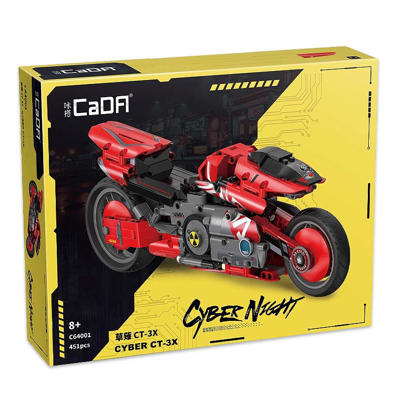Un diseño futurista de diseño vertiginoso, emulando el modelo Yaiba Kusanagi del video Cyber Punk 2077, construible de 451 piezas con suspensión, pie de apoyo retráctil y puedas deportivas de carrera.