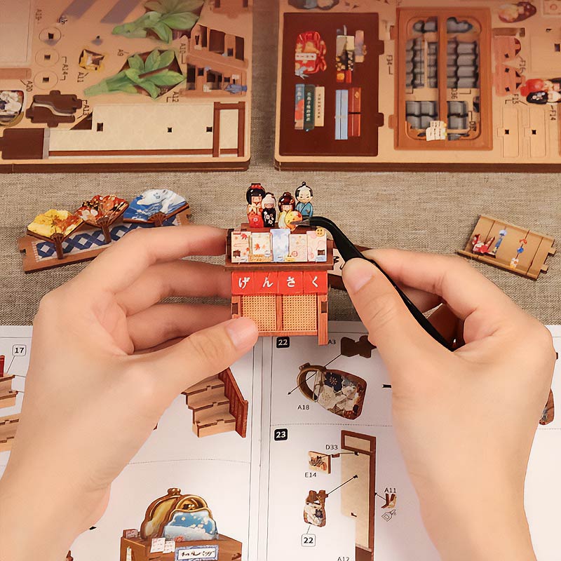 Cada pieza está diseñada para que vivas la experiencia de construir una escena única: desde los abanicos pintados a mano y los pequeños objetos de la vitrina, hasta los faroles, plantas y el techo de tejas que parece salido de un antiguo barrio de Kioto. Al encender la luz, la tienda cobra vida y revela cada rincón escondido, como si estuvieras frente a una mini película en pausa.