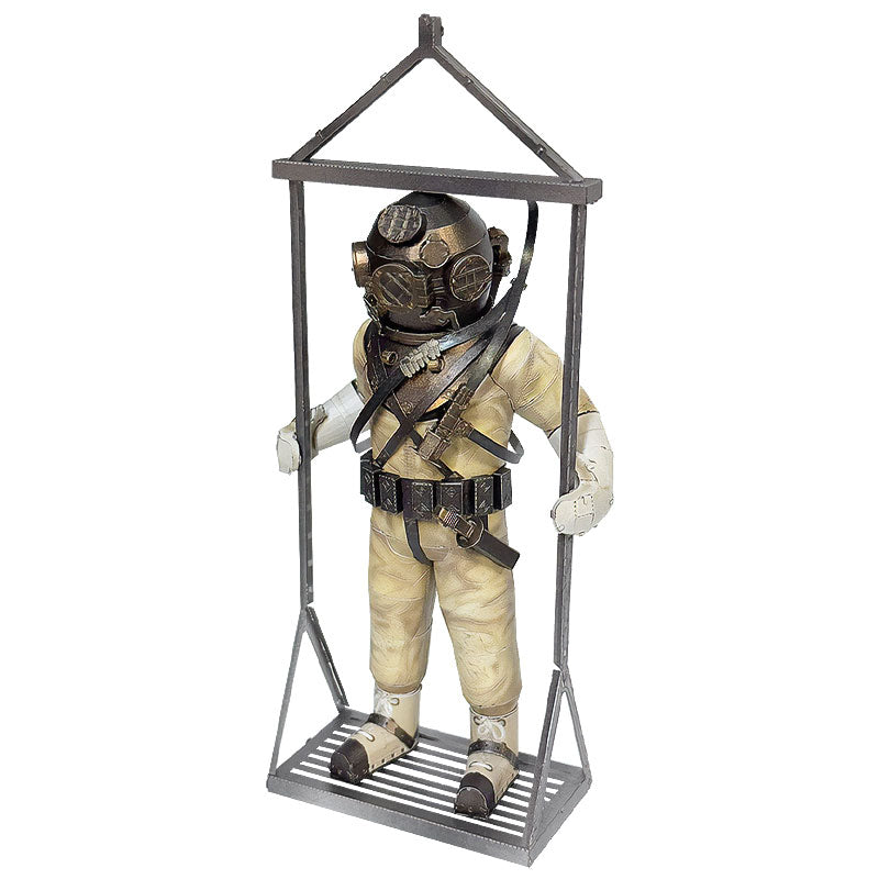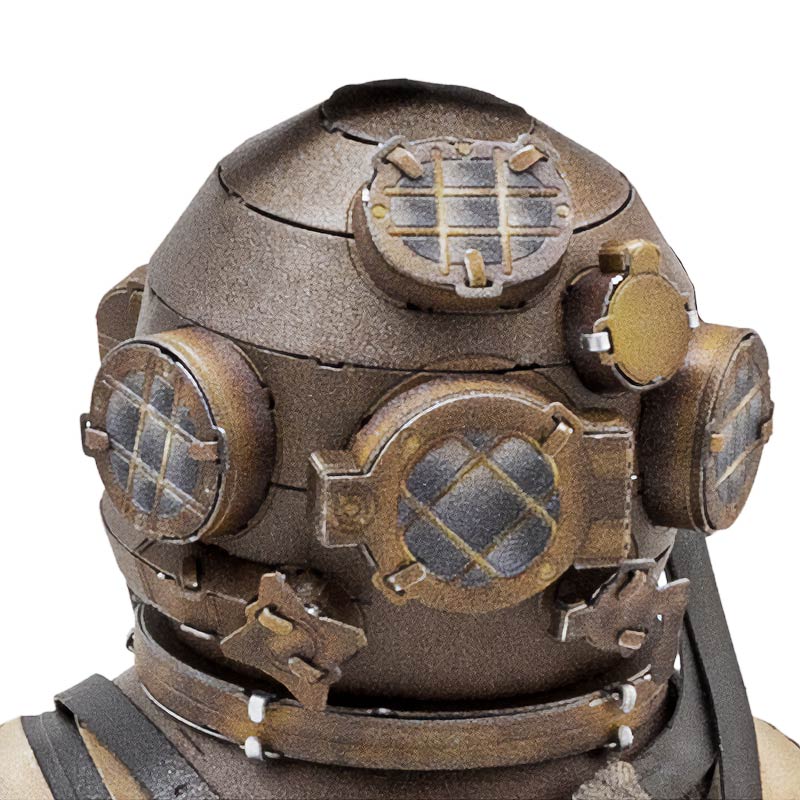 Este traje de buceo es una pieza metálica detallada que representa un traje clásico de buceo, con estética retro y un diseño basado en las unidades utilizadas durante las primeras expediciones profundas.