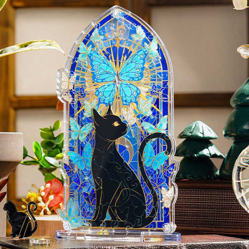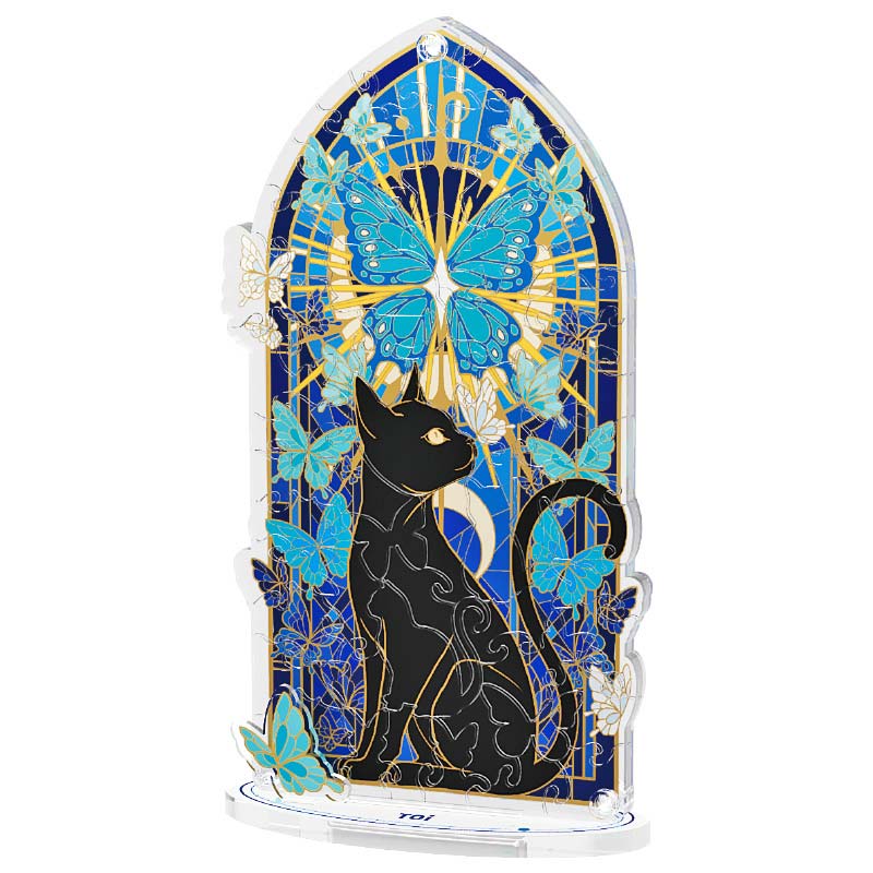 Este diseño es una oda a la elegancia misteriosa. En el centro, un Gato Negro de silueta perfecta se sienta con una mirada enigmática. Detrás de él, el fondo se construye con 60 piezas de acrílico que recrean un vitral azul profundo, del cual emergen mariposas de alas celestes. El resultado es una obra que parece flotar, capturando la luz y proyectando un halo de misterio y fantasía.